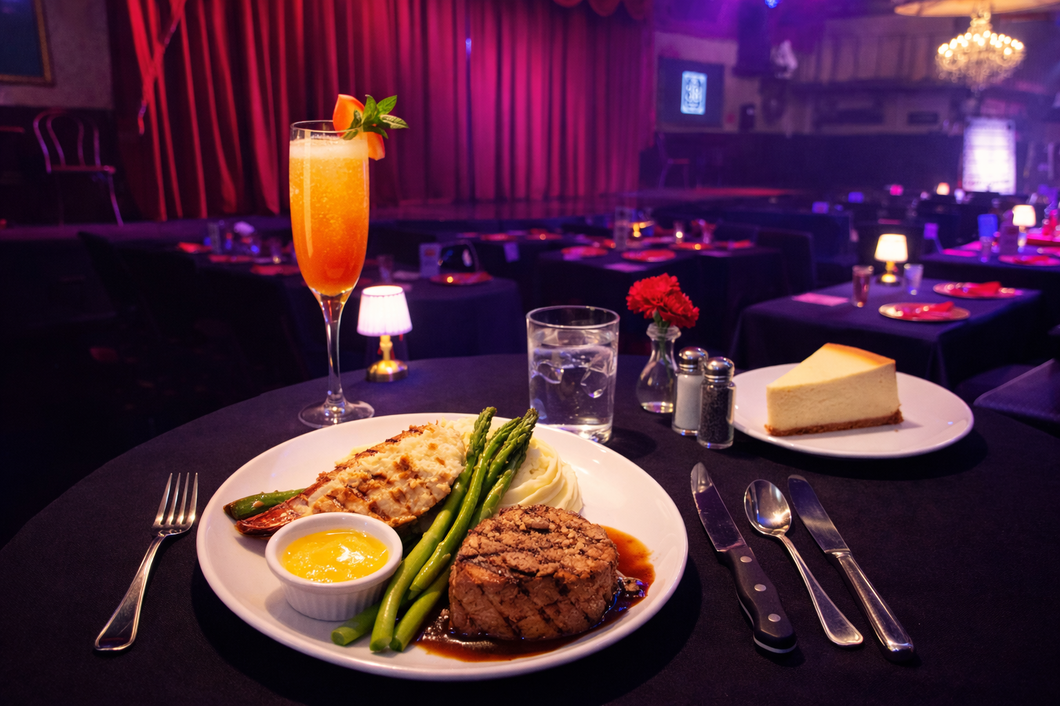 - A Mixed Green Salad or Caesar Salad An 8 oz Filet Mignon, A 4 oz Lobster Tail with Drawn Butter Buttery Whipped Potatoes Seasonal Vegetables A slice of New York–Style Cheesecake or Death By Chocolate Brownie