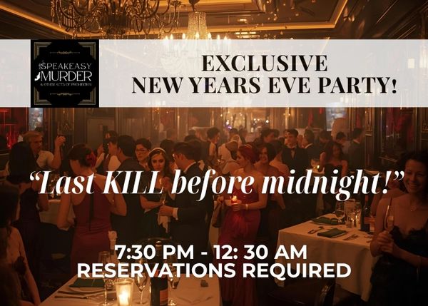 Ring in 2026 with style, mystery, and a little mischief at The Speakeasy Murder New Year’s Eve Party — an unforgettable night from 8 PM until midnight (doors open to reservation holders at 7:30 pm)!